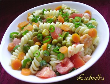 Ужин: салат с макаронами и сырыми или вареными овощами.